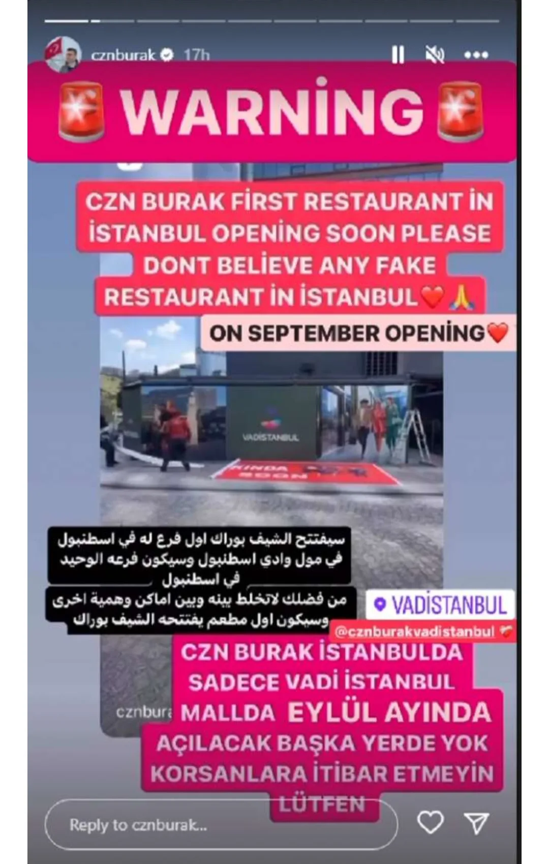 ومنذ ساعات قليلة، نشرت صفحة الشيف بوراك الرسمية، عبر موقع الصور والفيديوهات بخاصية «الاستوري» لقطات من استعداد مطعمه الوحيد للافتتاح، مدونا: «سيفتتح الشيف بوراك أول فرع له في إسطنبول في مول وادي إسطنبول، وسيكون فرعه الوحيد بالدولة، من فضلك لا تخلط بينه وبين أماكن وهمية أخرى»، بحسب صحيفة «زمان» التركية.
