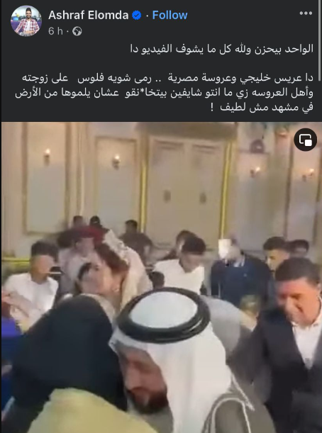 وعلق أحد رواد السوشيال ميديا على الفيديو المتداول عبر فيسبوك: “الواحد بيحزن والله كل ما يشوف الفيديو.. دا عريس خليجي وعروسة مصرية رمى شوية فلوس على زوجته وأهل العروسة زي ما انتو شايفين بيتخا-نقوا عشان يلموها من الأرض في مشهد مش لطيف.”