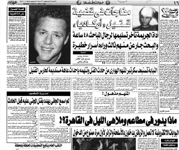في الساعة الثالثة والنصف فجرا، وقعت الجريمة بمشاجرة حامية الوطيس بين رجل الأعمال محمود محيي الدين روحي (37 سنة) صاحب شركة ليموزين لتأجير السيارات، وعمر جمال الدين الهواري صاحب شركة استيراد وتصدير، بسبب خلاف بينهما على معاكسة الفتيات على خشبة المسرح أثناء الرقص وكلاهما توعد للآخر.