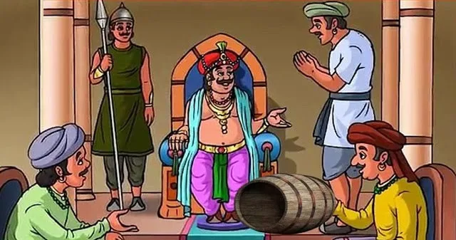 فجاء رجل فقير رث الثياب يحمل برميلاً كبيرًا، فقال له الملك: ما شأنك أنت والبرميل؟ فأجاب الرجل: جئت أسترد برميل الذهب الذي أقرضتك إياه!