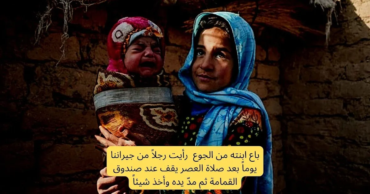 وظل الحال على نفس المنوال حتى مرت بنا ثلاثة أيام لم نأكل فيها شيء ، فأخذت أفكر في حل ينتشلنا من ألام الجوع والموت المحقق ، فلم أجد سوى فكرة مجنونة رأيتها حينها سوية ففكرت بأمر فاتحت به زوجتي ولكنها عارضتني ، ولكني تحت ضغط الجوع والفقر أقنعتها ، فقد قلت لها إلى متى سنظل عالقين بين الحياة الموت لا نجد لقمة نقتات بها ، فنحن على شفا حفرة من الهلاك ونحن إن صبرنا ابنتنا لن تصبر على الجوع .