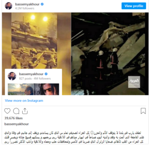 وفي سياق متصل،أعلن الفنان السورى باسم ياخور، أسرة صديقه المقرب، إثر الزلزال الذى سوريا صباح اليوم، وذلك في منشور عبر حسابه بتطبيق “انستجرام”.