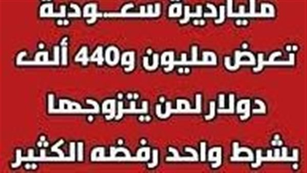 ذكرت مجلة سعودية أنها تلقت اتصالًا من سيدة أعمال سعودية تبلغ من العمر 33 عام وتسكن في مدينة جدة، غرب المملكة، تعرض فيه خمسة ملايين ريال(مليون و330 ألف دولار أميركي) لمن يتزوج منها “مسيارا”.