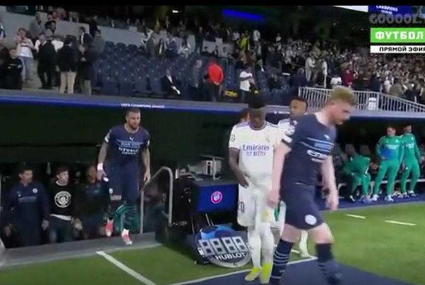 في لقطة تظهر كمية الاحترام و الانتماء التي يتمتع بها النجم البرازيلي فينسوس جونيور و تجنبه الدوس على شعار الملوك .. حاول ان يمنع كيفن دي بروين