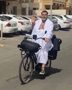 هذا .الرجل. اسمه .“غازي. أبو عبد.الرحمن”. انطلق .من مد.ينة. .ها.مبو.رغ. انية على. در.اجته .إلى بيت .الله.