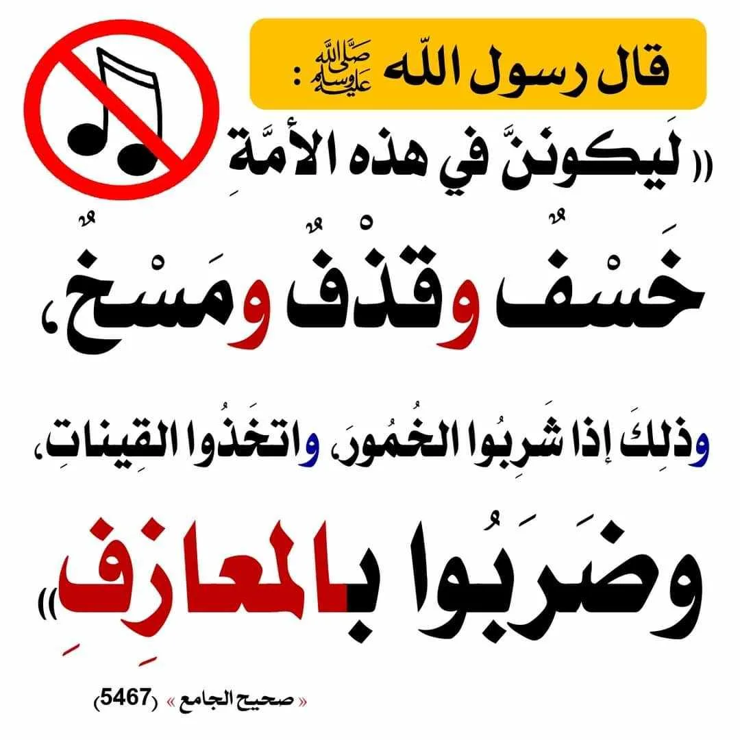 لَيَكونَنَّ مِن أُمَّتي أقْوامٌ يَسْتَحِلُّونَ الحِرَ والحَرِيرَ، والخَمْرَ والمَعازِفَ، ولَيَنْزِلَنَّ أقْوامٌ إلى جَنْبِ عَلَمٍ، يَرُوحُ عليهم بسارِحَةٍ لهمْ، يَأْتِيهِمْ -يَعْنِي الفقِيرَ- لِحاجَةٍ، فيَقولونَ: ارْجِعْ إلَيْنا غَدًا، فيُبَيِّتُهُمُ اللَّهُ، ويَضَعُ العَلَمَ، ويَمْسَخُ آخَرِينَ قِرَدَةً وخَنازِيرَ إلى يَومِ القِيامَةِ.
