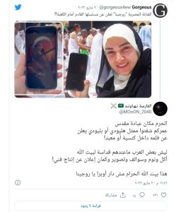 كذلك، كتبت أخرى: “العالم أصبح مهووساً بالتصوير وهو بالحرم طبعًا الغالبية ما فيه أي احترام لحرمة المكان وتعظيمه والقلب مهوس ومشغول بغير العمرة بالتصوير ..”.