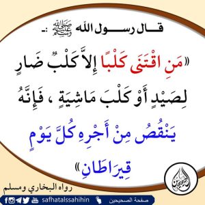 قال رسول الله -صلى الله عليه وسلم-: (مَنِ اقْتَنَى كَلْبًا، إلَّا كَلْبًا ضارِيًا لِصَيْدٍ أوْ كَلْبَ ماشِيَةٍ، فإنَّه يَنْقُصُ مِن أجْرِهِ كُلَّ يَومٍ قِيراطانِ)،[٢] ووجه الدلالةِ من هذا الحديثِ أنَّ اقتناءَ الكلابِ لغير الصيد والحراسةِ يؤدي إلى انتقاصِ أجرِ المسلم كلَّ يومٍ.