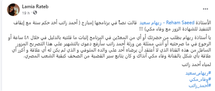 وعبر حسابها على Facebook، كتبت لمياء راتب “الأستاذة Reham Saeed – ريهام سعيد قالت نصاً في برنامجها إمبارح ( أحمد راتب أخد حكم سنة مع إيقاف التنفيذ للشهادة الزور مع وفاء مكي) !!!