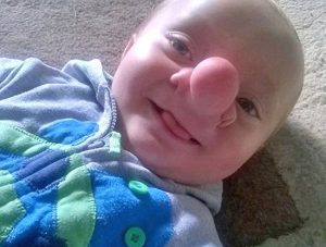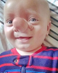 وكان الطفل “أولى تريزيس” والذى يبلغ من العمر 21 شهراً، يعانى من حالة نادرة للغاية تسمى “التهاب الدماغ” والتى تسببت له فى فجوة داخل جمجمته ونمو جزء من دماغه داخل أنفه، لذلك أطلقت عليه والدته اسم “بينوكيو”.