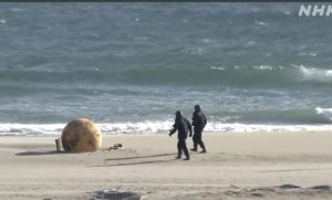 امرأة يابانية عثرت صباح اليوم على كرة حديدية مجهولة قطرها 1.5 متر بأحد سواحل مدينة هاماماتسو فاتصلت بالشرطة التي أتت وطوقت المكان ومنعت الاقتراب من المنطقة.
