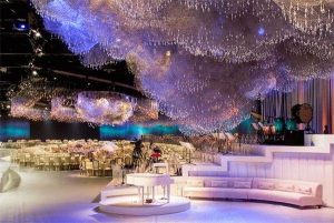 العريس والتى شاركته التصميم هى شركة “ديزاين لاب ايفنتس” واستخدم فى تصميم القاعة 65 الف قطعة كريستال ، و 15 الف عصا مضيئة و 4 الالف طائرة ورقية