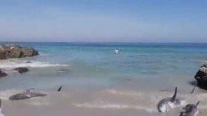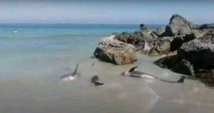 وكان رواد مواقع التواصل الاجتماعي تداولوا م فيديو يظهر محاولات ب الأشخاص إنقاذ الدلافين وإعادتها للمياه، إلا أنه كلما تمت إعادتها للمياه عاودت الكرة مرة أخرى وسبحت نحو الشاطئ