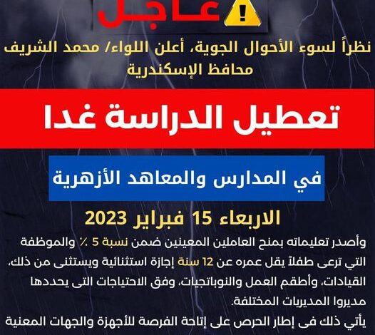 #عاجل? ⭕️أعلن اللواء/ محمد الشريف # تعطيل الدراسة غداً الأربعاء 15 فبراير بجميع المدارس الحكومية والخاصة والمعاهد الأزهرية ( طلاب ومعلمون ) بنطاق المحافظة، وذلك نظراً لسوء الأحوال الجوية. ?وأصدر المحافظ تعليه بمنح العاملين المعينين ضمن نسبة 5 ٪ وكذلك الموظفة التي ترعى طفلاً يقل عمره عن اثني عشرة سنة ميلادية إجازة استثنائية غداً الأربعاء