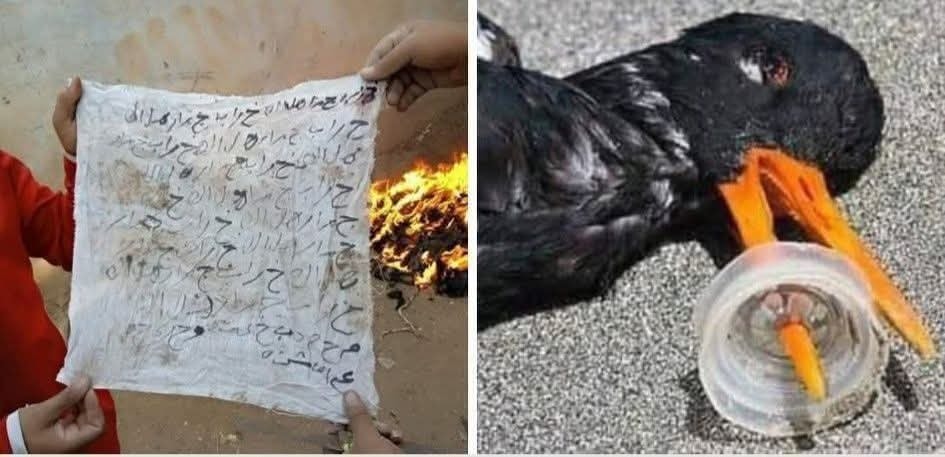 ومتخيط عليه وكان في قوالب كوب متكفنه مكتوب عليها طلاسم وصور لناس من البلد ووسط دا كله كان في صورة اخت ابراهيم عليها نجمه سداسية مكتوب بيه خړاب وعدم خلفه
