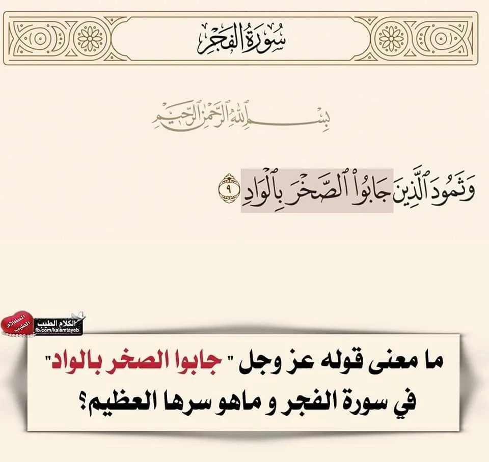 ما معنى قوله عز وجل ” جابوا الصخر بالواد”” فى سورة الفجر؟ هناك من الآيات القرآنية اللاتي يكون المعنى الظاهري فيها مختلفا عن المعنى الحقيقي لها، فالمتدبر لآيات كتاب الله – سبحانه وتعالى – والباحث في معاني الآيات قد يجد اختلافا في معاني بعض الكلمات عن منطوقها